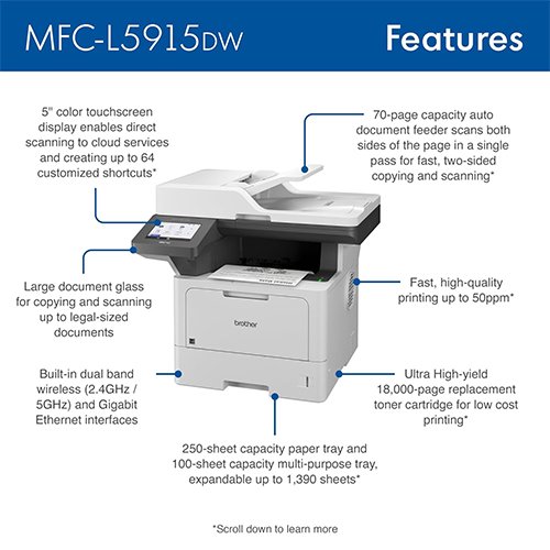 Brother Professional Laser Printer All-in-One with Scanner and Copier, High-Speed 50 ppm Monochrome Printing, Wireless Network Ready, Dual-Band WiFi, Auto 2-Sided Print (MFC-L5915DW)