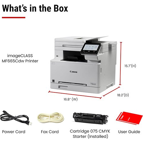 | Included Components | Canon Genuine Toner 075 CMYK Starter: 500 Yield CMY, 700 Yield Black, Documentation, Fax Cable, Power Cord, imageCLASS MF665Cdw Printer |
