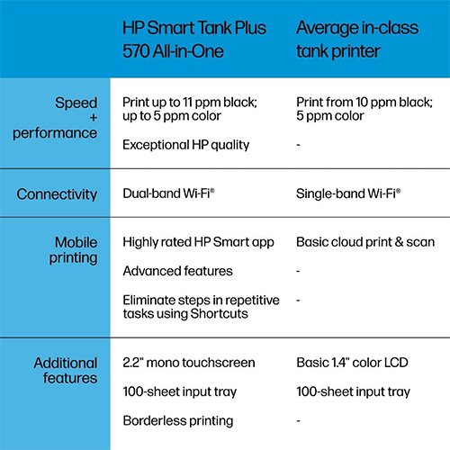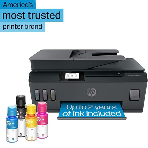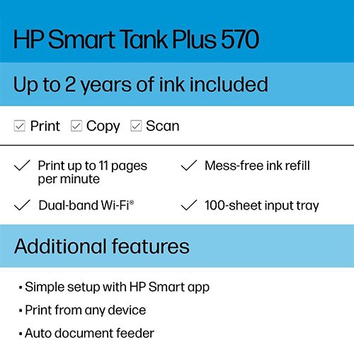 | Included Components | 5HX14A HP Smart Tank Plus 570 Wireless All-in-One printer; HP 32XL 135-ml Black Original Ink Bottle; HP 31 70-ml Cyan Original Ink Bottle; HP 31 70-ml Magenta Original Ink Bottle; HP 31 70-ml Yellow Original Ink Bottle; HP Black Printhead; HP Tri-color Printhead; Ink caution flyer; Repacking flyer; Setup guide; Reference guide; Regulatory flyer; Power cord |